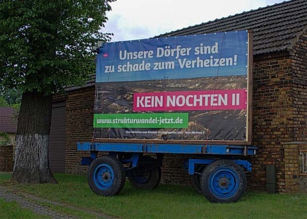 "Strukturwandel jetzt - kein Nochten II" am Ortseingang in Rohne ein großes Banner mit diesem Wortlaut auf. Der Widerstand gegen den Tagebau wird damit in der Region deutlich sichtbarer als bisher.
