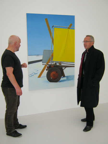 Ausstellungen des Kunstmuseums Dieselkraftwerk in Cottbus besuchte, trat völlig unerwartet ein Bezug zur Brandenburgischen Energiepolitik zu Tage: Der Künstler Thoralf Knobloch hat in seinem Werk "X" dem Widerstand gegen CO2-Endlager und Umsiedlungen ein Denkmal gesetzt. Das Gemälde zeigt ein gelbes Kreuz und ein aufgespanntes Transparent - hintergründiger Weise von hinten - sowie eine versteckte Andeutung auf bedrohte Orte in der Lausitz. Es ist Teil der Ausstellung "Im Abseits", die noch bis zum 1. Juli im Dieselkaftwerk gezeigt wird. Das Foto zeigt MdB Neskovic (r.) mit Museumskurator Jörg Sperling vor dem Werk. (Foto: Büro Nešković)